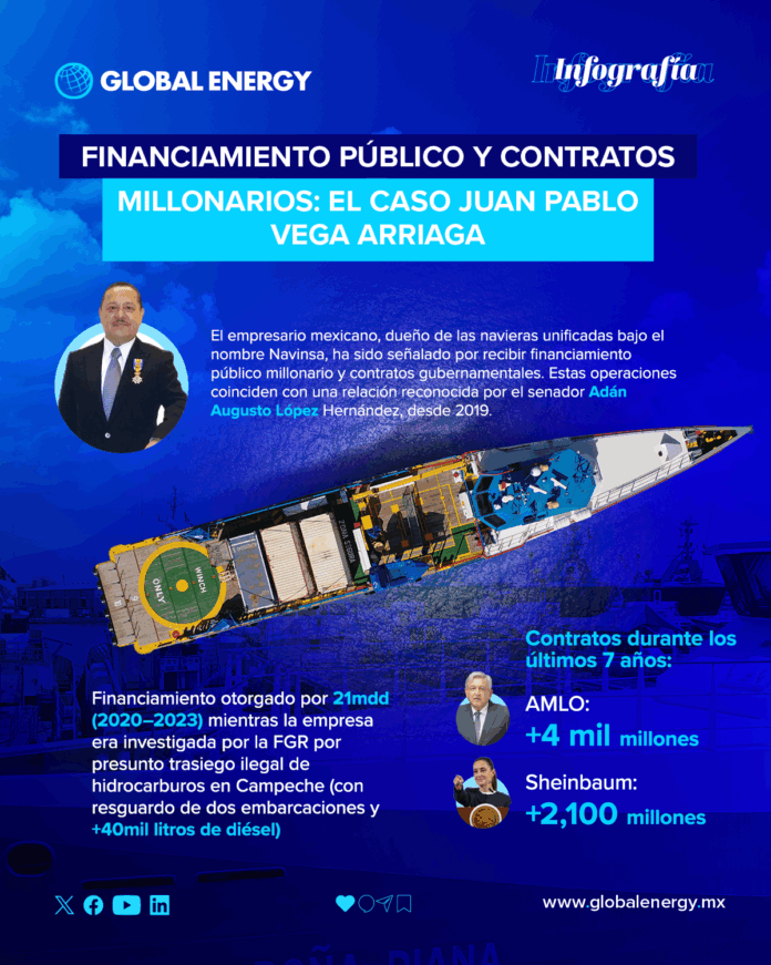 Las empresas Naviera Integral y Naviera Petrolera Integral, ambas vinculadas a Vega Arriaga, han sido contratistas de Pemex Exploración y Producción (PEP) desde hace más de una década. De acuerdo con reportes, estas compañías han recibido más de 6 mil millones de pesos en contratos públicos en los últimos siete años, incluyendo más de 4 mil millones durante el sexenio de Andrés Manuel López Obrador y más de 2 mil 100 millones en el primer año de la administración de Claudia Sheinbaum.