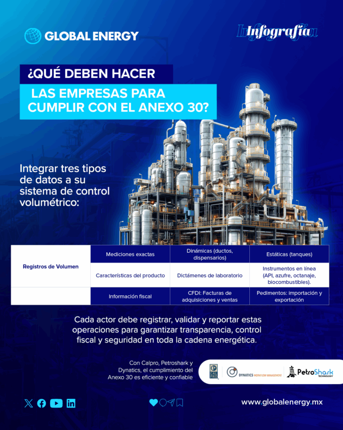 Las empresas del sector energético que operan en México están obligadas a integrar tres tipos de datos en sus sistemas de control volumétrico para cumplir con el Anexo 30, disposición fiscal que busca fortalecer la trazabilidad y supervisión en la cadena de suministro de hidrocarburos.