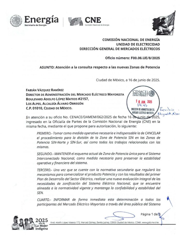 El Centro Nacional de Control de Energía (CENACE), bajo la autorización de la Comisión Nacional de Energía (CNE), ha anunciado la cancelación de la división de la Zona de Potencia del Sistema Interconectado Nacional (SIN) en SIN-Norte y SIN-Sur; manteniendo así un esquema único, con el propósito de preservar la estabilidad operativa y financiera del sistema eléctrico.