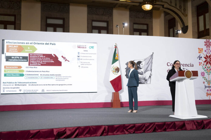 La Comisión Federal de Electricidad (CFE) informó que ha restablecido el 84.7% del suministro eléctrico en los cinco estados más afectados por las lluvias torrenciales ocurridas entre el 6 y 9 de octubre, según datos presentados por la directora general, Emilia Calleja Alor.