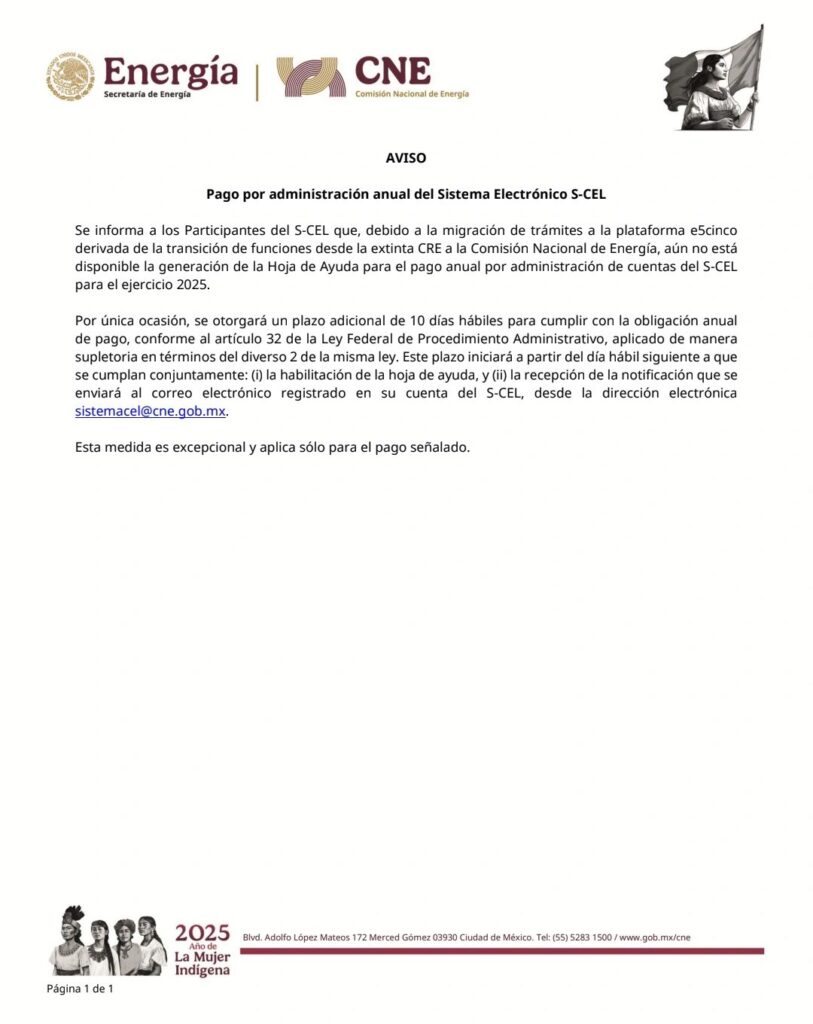 La Comisión Nacional de Energía (CNE) informó que, debido a la migración de trámites a la plataforma e5cinco y a la reestructuración derivada de la transferencia de funciones desde la extinta CRE, aún no se encuentra habilitada la generación de la hoja de ayuda correspondiente al pago anual por administración de cuentas del Sistema Electrónico de Gestión de Certificados y Cumplimiento de Obligaciones de Energías Limpia (S-CEL) para el ejercicio fiscal 2025.