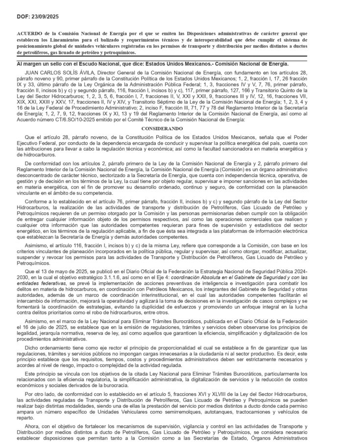 La Comisión Nacional de Energía (CNE) publicó en el Diario Oficial de la Federación (DOF) el acuerdo que establece los lineamientos técnicos y administrativos para el balizado, los requisitos del código QR y el uso obligatorio de sistemas GPS en todas las unidades vehiculares que transportan petrolíferos, gas LP y petroquímicos por medios distintos a ductos en México.