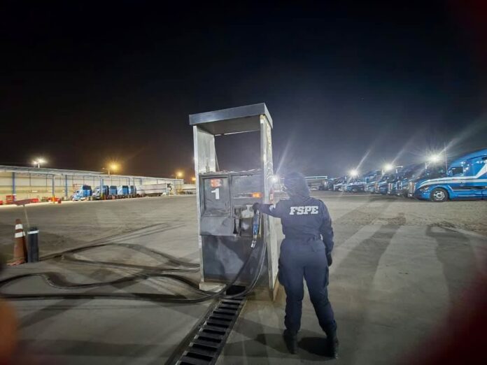 El predio, ubicado sobre la carretera León–Comanjilla, operaba como punto de almacenamiento y distribución de combustible de procedencia ilícita. Durante la inspección, agentes del Ministerio Público Federal identificaron un tanque con 23,700 litros de hidrocarburo, una máquina expendedora de gasolina sin documentos, así como 33 tractocamiones y 18 cajas secas presuntamente usados en el traslado y almacenamiento del producto.
