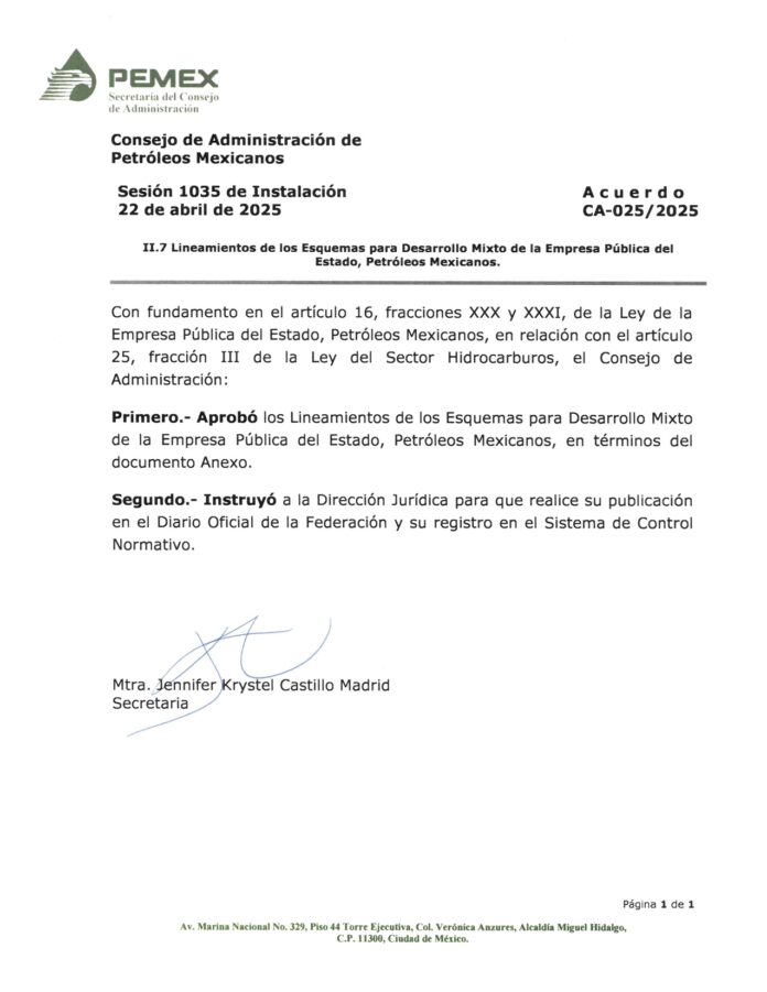 El Consejo de Administración de Petróleos Mexicanos (Pemex) aprobó los Lineamientos de los Esquemas para Desarrollo Mixto, un marco que busca optimizar la producción petrolera mediante asociaciones estratégicas mediante la colaboración con el sector privado. Estos esquemas, establecidos en el acuerdo CA-025/2025 durante la sesión 1035 del Consejo, permitirán la asociación con empresas privadas para compartir costos, riesgos e inversiones en actividades de exploración y extracción de hidrocarburos.