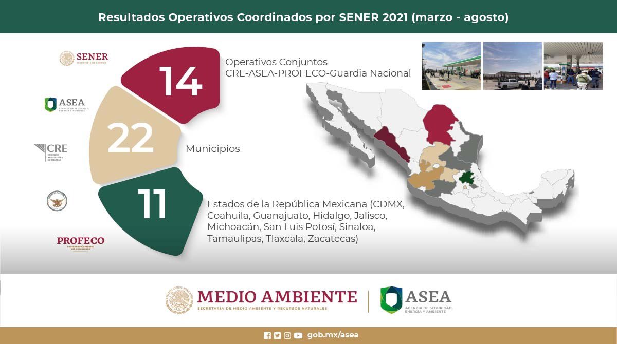 La Agencia Nacional de Seguridad Industrial y de Protección al Medio Ambiente del Sector Hidrocarburos (ASEA) reportó los resultados de los operativos interinstitucionales con la Secretaría de Energía en el periodo comprendido de marzo a agosto de 2021, con el acompañamiento de la Comisión Reguladora de Energía (CRE), la Procuraduría Federal del Consumidor (Profeco) y la Guardia Nacional: