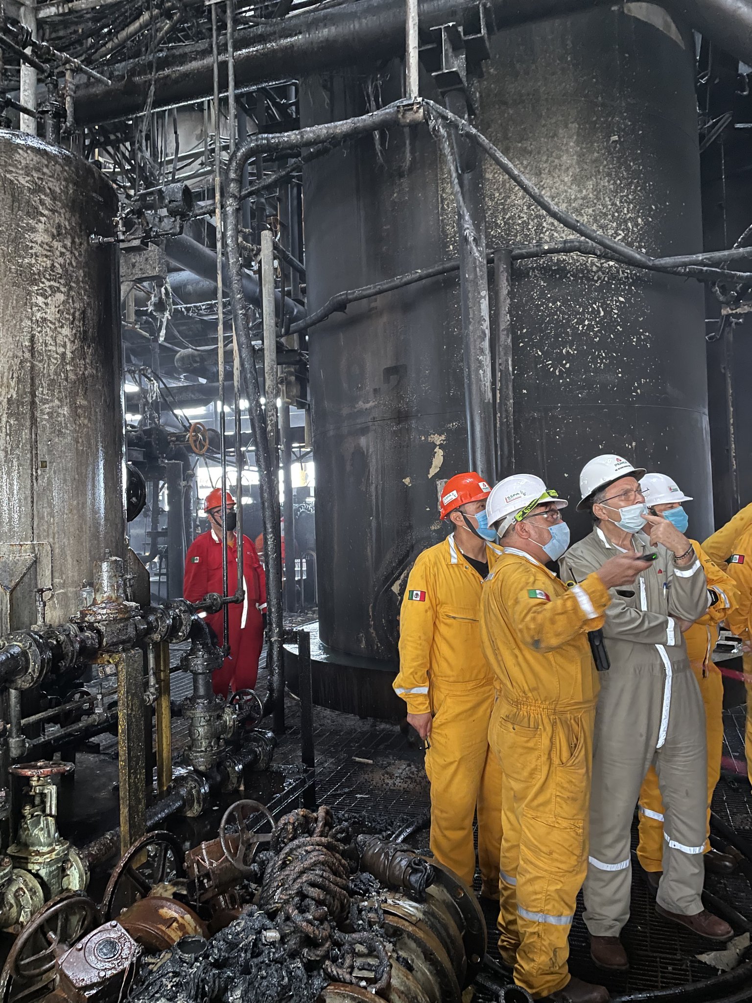 El Director General de Petróleos Mexicanos (Pemex), Octavio Romero, recorrió la plataforma E-Ku-A2, donde el pasado domingo ocurrió un incendio que cobraría la vida de por lo menos cinco personas.