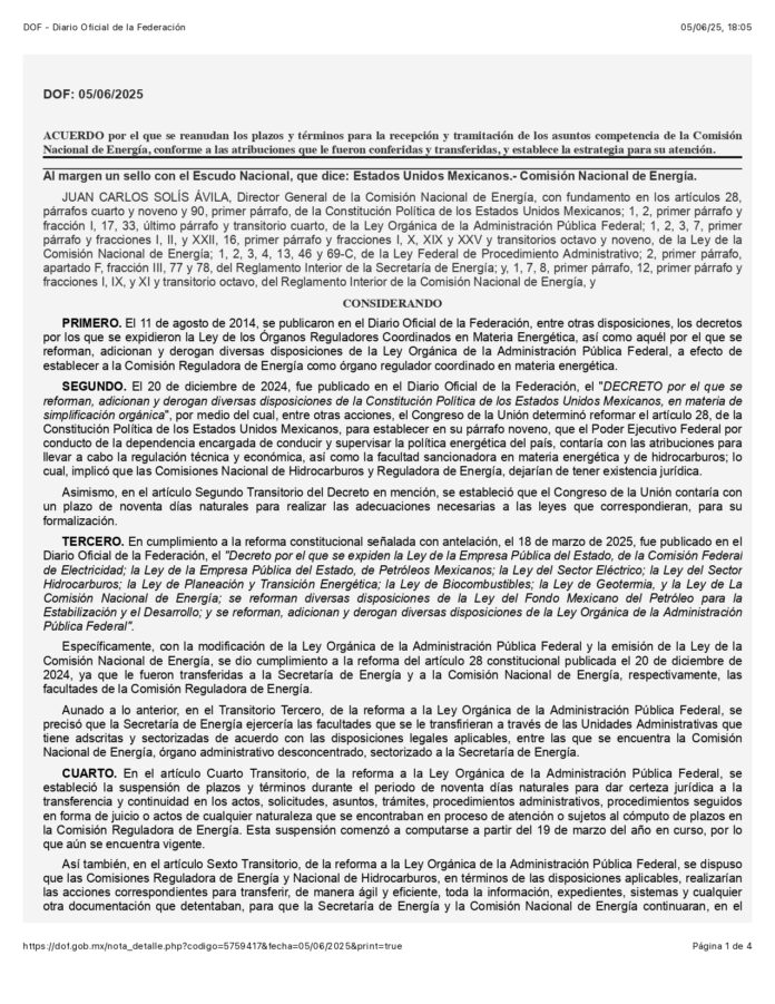 El acuerdo, firmado por Juan Carlos Solís Ávila, director de la CNE, establece que el organismo debe recibir, atender y resolver los asuntos que estaban pendientes, excepto ciertos casos relacionados con nuevas solicitudes de permisos, modificaciones en la estructura de capital social y ajustes de tarifas. Dichas excepciones se gestionarán una vez que entren en vigor los reglamentos de las Leyes del Sector Eléctrico, del Sector Hidrocarburos y de Planeación y Transición Energética.